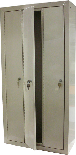 The FLCR-748-3 Rifle Cabinet is similar in design to the FLC-707 style pistol lockers with taller compartments for securing long guns & rifles. Fabricated of all 16 steel body & doors. Doors are channel formed with welded corners for rigidity. Each compartment large enough for 1 to 2 weapons. Overall rifle cabinet size is 24” wide x 48” high & 10” deep.